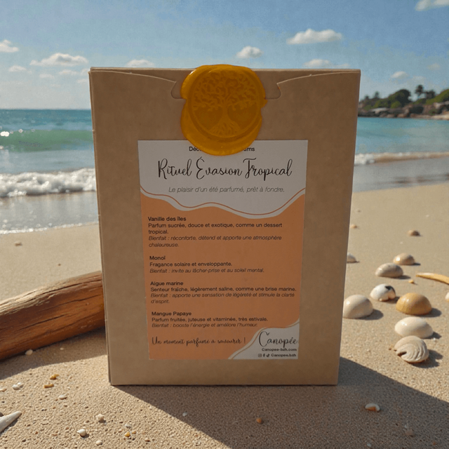 Embarquez pour un voyage parfumé avec le kit Évasion Tropicale. Les fondants diffusent des notes de mangue-papaye, monoï, eau marine et vanille des îles, pour une ambiance ensoleillée et exotique.